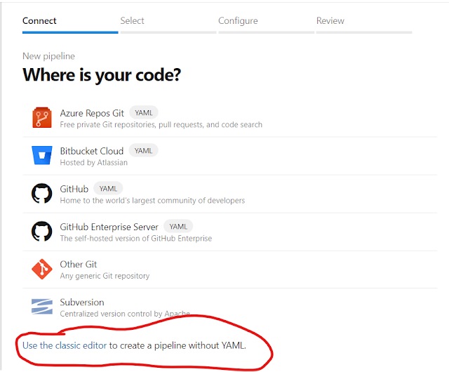 - Click on "Use the classic editor" link in the bottom to create a pipeline without YAML.